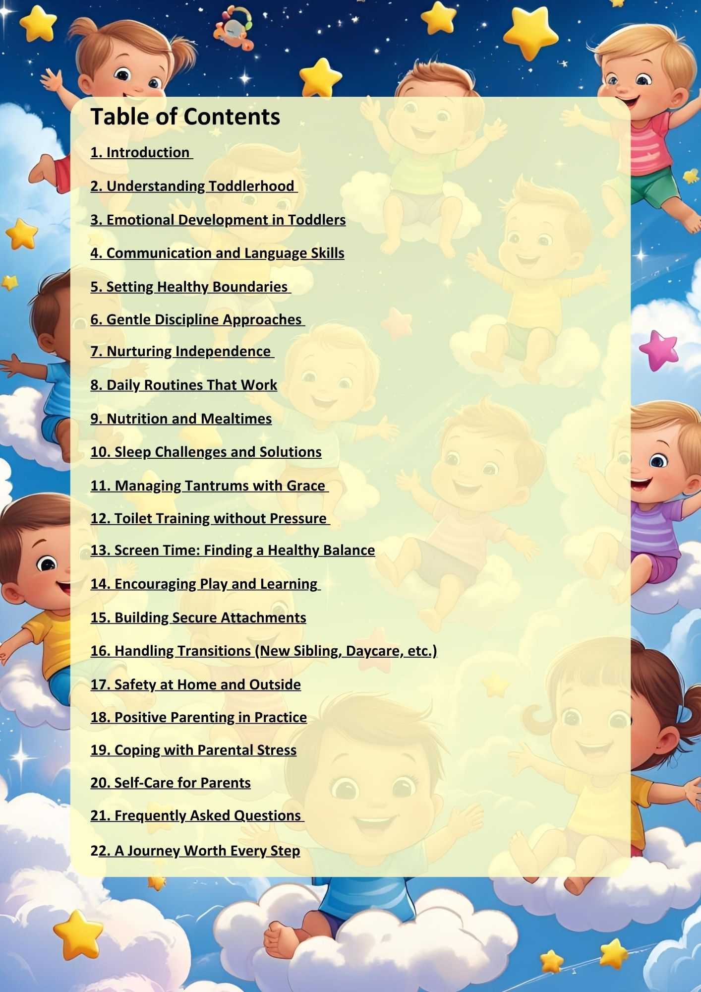 Raising Happy Toddlers – A Complete Parental Guide is your trusted companion for navigating the toddler years with confidence and care. This 30-page digital guide is packed with practical tips, expert-backed strategies, and real-world insights to help parents nurture emotionally resilient, joyful, and well-adjusted toddlers. From managing tantrums and building routines to encouraging independence and positive discipline, this guide empowers you to create a calm, loving, and connected family environment. Whether you’re a first-time parent or looking for fresh ideas, this easy-to-read eBook is your go-to resource for raising happy, thriving toddlers.